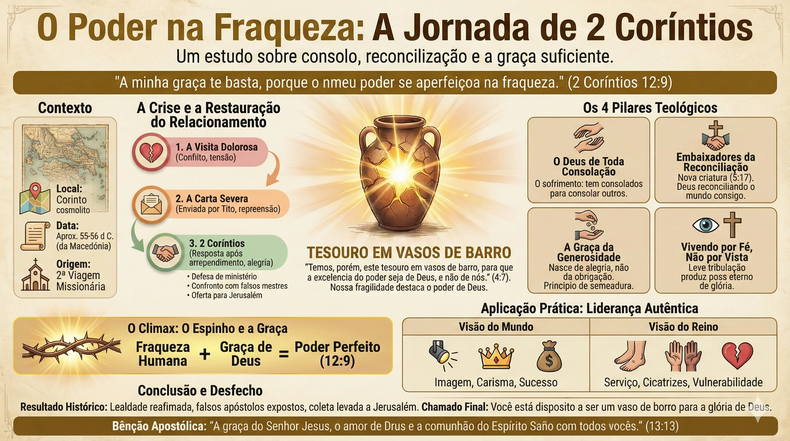 O Coração (Slides 5-9): Foque aqui. Ao projetar "Vasos de Barro", enfatize que a fragilidade revela o poder. Use "O Espinho e a Graça" como clímax para a aceitação das fraquezas.