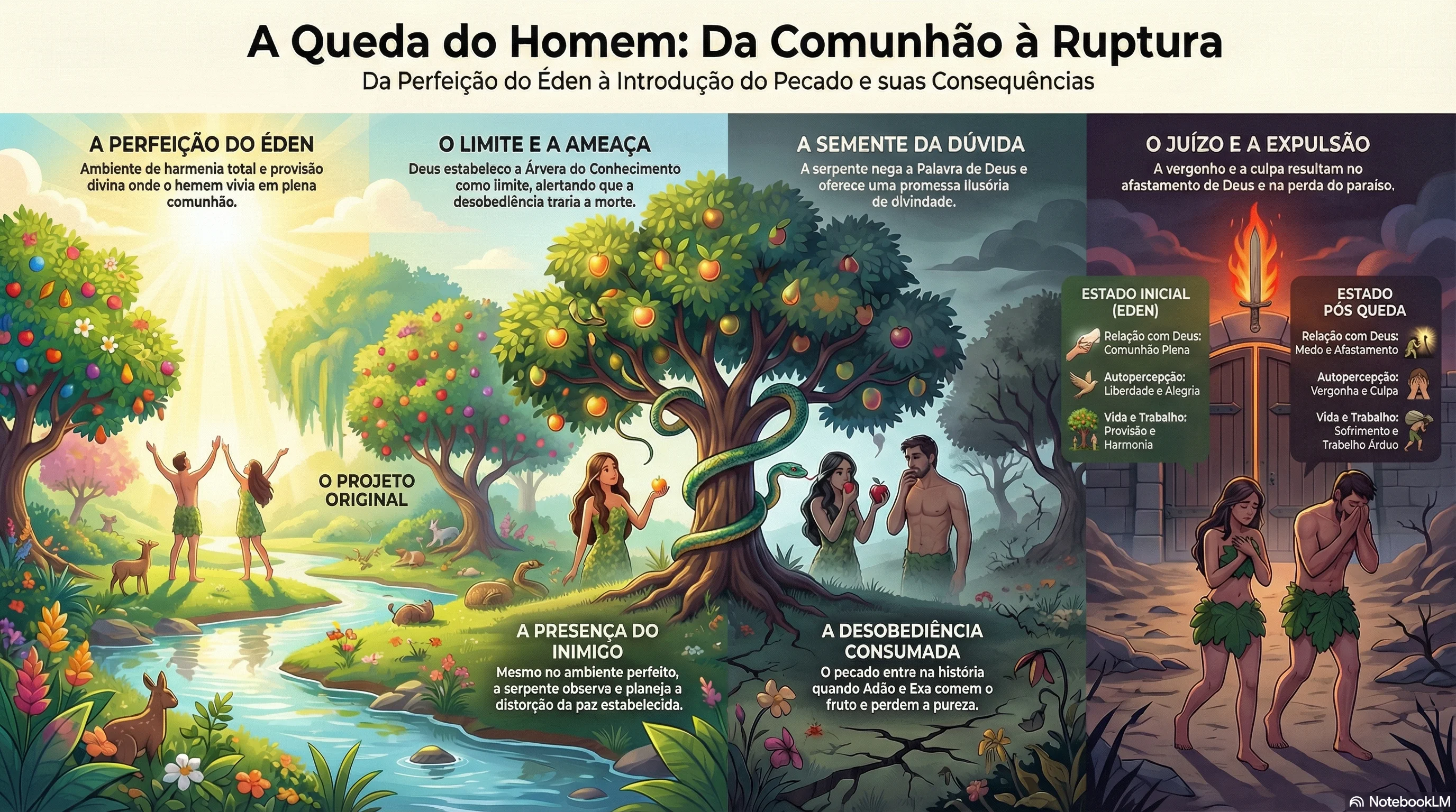 A Queda: Destaque a promessa falsa de "serem como Deus". Mostre a transição imediata para a "vergonha e culpa" após o ato.
